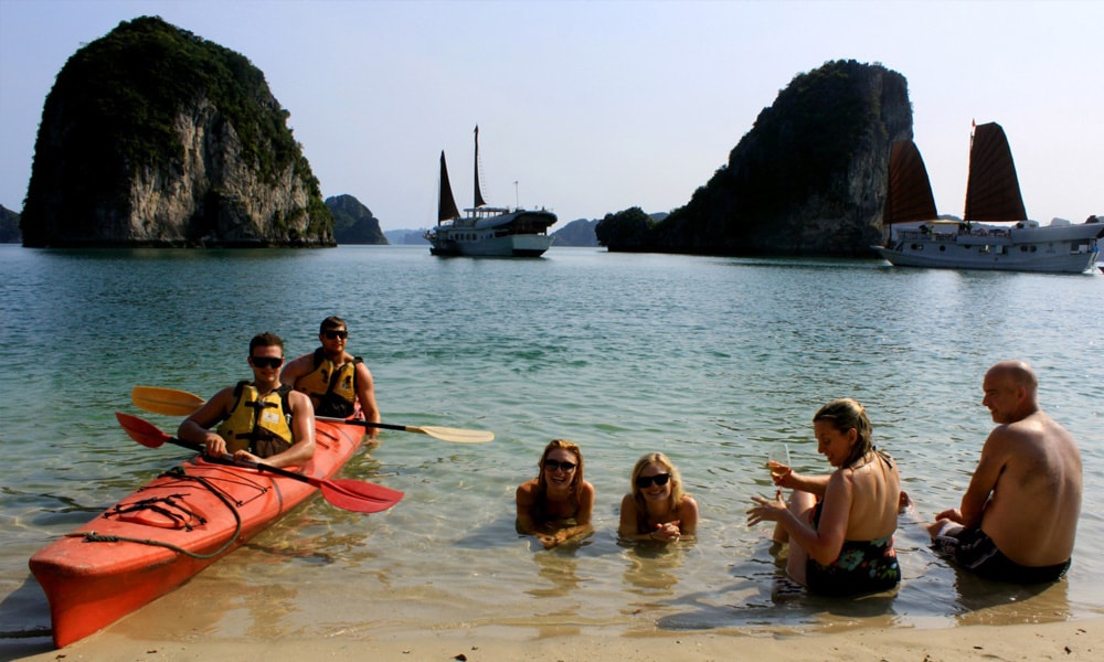 An understandably popular activity in Halong Bay, most people just lie on the white sand beach, watching the boats skim the water in the distance in front of the iconic Halong Bay mountains. There are also deck chairs and a small outdoor shower available.