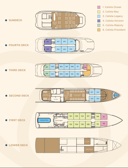 Calista Cruise possesses a sophisticated design on 5 decks and a top-notch system of amenities: Oceanus 225m² infinity pool, Oasis outdoor Jacuzzi, Bayview Restaurant & Pearl Dining Room, Calista Breeze Bar,... The ship has 38 spacious rooms divided into 6 categories, all with private balconies, bay-view bathtubs, and many rooms with private jacuzzis, ideal for couples, families, or friends.